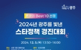 광산구 클릭뉴스2024. 12.02[클릭뉴스]올해 광주시의 ‘베스트10 정책’은 뭘까? 광주시민들이 광주를 빛낸 우수정책들을 직접 뽑는다. 광주광역시는 오는 5일 시청 대회의실에서 ‘2024년 광주를 빛낸 스타정책 경진대회’를 개최한다. 올해 두 번째로 여는 ‘스타정책 경진대회’는 기존 우수정책 평가의 단점을 보완해 일회성 평가가 아닌 지난 4월부터 11월까지 8개월동안 연중 지속해 진행됐으며, 평가방법도 혁신적으로 전환해 전문가와 공무원 중심에서 시민 중심의 평가가 이뤄지도록 했다. 이 행사는 시민 중심의 연중 지속 평가인 ‘정책평가박람회’의 하나로, …