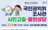 순천시 클릭뉴스2024. 11.29[클릭뉴스]순천시는 오는 12월 5일 10시부터 16시까지 시청 대회의실에서 국민권익위원회 ‘달리는 국민신문고’를 운영한다고 전했다. ‘달리는 국민신문고’는 국민권익위원회가 주관하는 프로그램으로, 시민들이 공공 서비스와 관련된 다양한 불편 사항을 직접 상담하고 해결할 수 있는 자리이다. 이번 행사에서는 권익위 조사관과 전문가 20여 명이 참여해 행정, 교육, 보훈, 세무, 복지, 노동, 건축 등 공공 서비스뿐만 아니라 소비자 피해, 지적 분쟁, 신용 회복, 민․형사 생활법률 등 생활 속 다양한 문제를 상담하고 해결 방안을 제공…