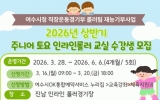 여수시 클릭뉴스2026. 03.12[클릭뉴스]여수시가 지역 유소년을 대상으로 ‘2026년 상반기 주니어 토요 인라인롤러 교실’을 운영하고 오는 3월 16일부터 20일까지 수강생을 선착순 모집한다. 이번 프로그램은 관내 유치원생과 초등학생 50명을 대상으로 진행되며 여수시청 직장운동경기부 롤러팀 선수들이 재능기부 형식으로 직접 지도에 나선다. 참가자들은 기본적인 롤러교육과 기초기술을 배우고 인라인롤러 주행 능력을 향상할 수 있는 다양한 기술을 익히게 된다. 신청은 수강을 희망하는 유치원·초등학생 보호자가 여수시OK통합예약시스템을 통해 신청할 수 있다. 재능…