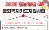 무안군 클릭뉴스2026. 03.12[클릭뉴스]무안군은 청년의 문화생활과 자기계발을 지원하기 위해 ‘2026년 전남 청년 문화복지카드 지원사업’ 대상자를 모집하고 있다고 밝혔다. 올 2월 한 달간 접수 결과 방문 신청 170건, 온라인 신청 2,075건 등 총 2,245건이 접수됐으며, 군은 아직 신청하지 못한 청년들이 지원을 받을 수 있도록 3월 말까지 추가 접수를 진행할 예정이다. 지원 대상은 2024년 2월 9일 이전부터 전라남도에 주소를 두고 무안군에 2년 이상 거주한 19세부터 28세까지(1998~2007년 출생) 청년이다. 대상자로 선정되면 1인당 …