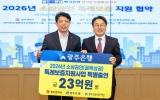 전라남도 클릭뉴스2026. 01.22[클릭뉴스]광주은행은 22일 광주광역시청에서 강기정 광주광역시장, 정일선 광주은행장, 염규송 광주신용보증재단 이사장 및 관계자가 참석한 가운데 ‘2026년 소상공인 특례보증 대출 지원사업 협약’을 체결했다고 밝혔다. 이번 협약을 통해 광주은행은 고금리와 경기침체 등으로 어려움을 겪는 광주지역 소상공인(골목상권)에 대한 금융지원 확대를 위해 23억 원을 특별출연했다. 이를 재원으로 광주신용보증재단은 총 466억 원 규모의 특례보증을 지원하며, 광주광역시는 1년간 3~4%의 이차보전을 지원할 계획이다. 소상공인 특례보증 융자 지…