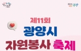 광양시 클릭뉴스2025. 11.07[클릭뉴스]광양시는 오는 11월 15일 성황스포츠센터 다목적체육관에서 광양시자원봉사단체협의회 주관으로 ‘제11회 광양시 자원봉사 축제’를 개최한다고 밝혔다. ‘광양시 자원봉사 축제’는 한 해 동안 지역사회 발전을 위해 헌신한 자원봉사자들을 격려하고, 시민 모두가 함께 나눔의 가치를 공유하는 축제의 장이다. 올해 행사에서는 ▲광양시립합창단 공연 ▲자원봉사 플래시몹 퍼포먼스가 펼쳐지고, 24개의 자원봉사 체험부스가 운영된다. 또한 봉사활동의 성과를 담은 사진전이 열리고, 기념사진을 찍을 수 있는 포토존도 마련돼 자원봉사의 의미를…