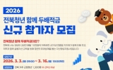 무주군 클릭뉴스2026. 03.04[클릭뉴스]무주군이 오는 16일까지 지역 청년의 생활 안정 기반 조성을 위한 ‘전북청년 함께 두 배 적금’ 참여자 15명을 모집(자세한 내용 무주군청 누리집에서 공지사항 확인)한다. 2년 만기 ‘전북청년 함께 두 배 적금’은 매월 10만 원 납부 시 지자체에서 10만 원을 추가로 적립해 주는 방식으로, 만기 시 본인 저축액의 두 배인 480만 원과 이자를 함께 받을 수 있다. 지원 대상은 공고일 기준 무주군에 거주하며, 최소 5개월 이상 근로(사업자 포함)를 지속 중인 청년으로 기준중위소득 140% 이하인 만 18~39세(19…