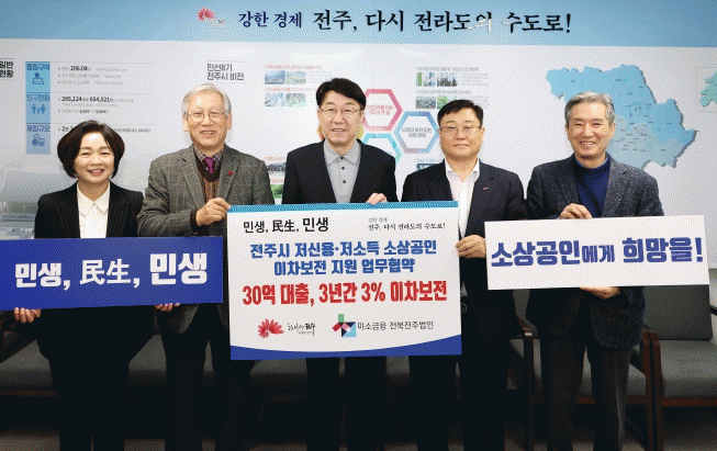 이날 협약에 따라 시는 저신용·저소득 소상공인에 대해 대출이자를 3년간 3%씩 이차보전에 나설 계획이다. 또, 미소금융 전북전주법인은 지원대상자에 대한 상담 및 대출 실행에 나서고, 소상공인연합회는 더 많은 소상공인이 혜택을 받을 수 있도록 홍보에 힘쓸 예정이다.