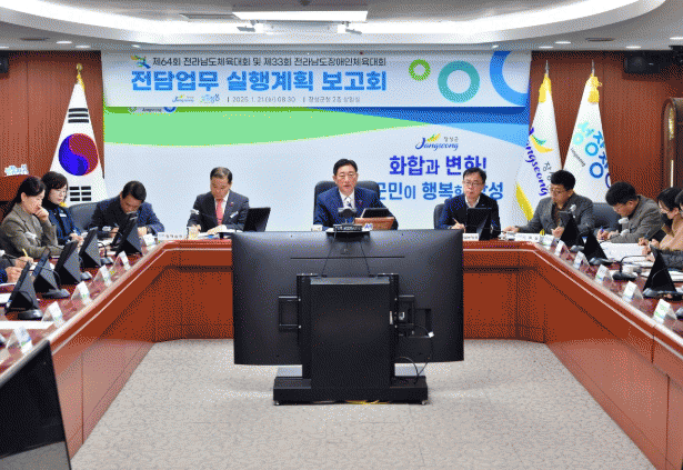 군은 21일 군청 상황실에서 김한종 장성군수, 간부공무원이 참석한 가운데 제64회 전남체전 및 제33회 전남장애인체전 성공개최를 위한 부서별 전담업무 실행계획 보고회를 열었다.