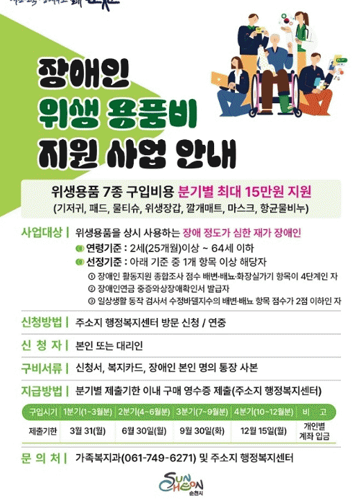위생용품비 지원 대상은 순천시에 거주하는 2세 이상 64세 이하 배변·배뇨에 어려움이 있는 장애정도가 심한 장애인이며, 위생용품 구매영수증을 거주지 관할 행정복지센터에 제출하면 분기별 15만원 한도내에서 구매금액 전부를 지원받을 수 있다.