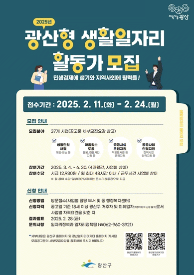 광산형 생활일자리 활동은 생활민원 해결, 공공사업 인력 지원 등 총 37개 사업에 참여하며 광산구에 거주하는 미취업자를 대상으로 3월부터 6월까지 4개월 동안 활동할 150명을 모집한다. 참여 수당 일부는 온누리상품권으로 지급한다.