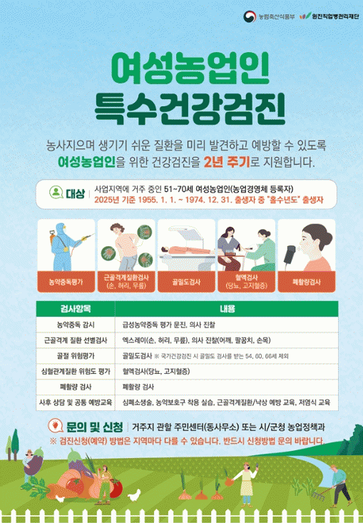 여성농업인 특수건강검진은 농작업으로 인해 나타날 수 있는 다양한 질병을 예방하기 위한 검진으로 근골격계, 심혈관계, 골절·손상위험도, 폐활량, 농약중독 총 5개 영역 10개 항목에 대해 검진을 진행한다.