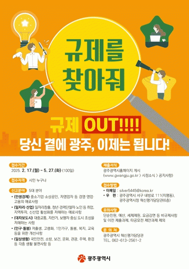 특히 올해 시정 목표인 ‘2025 광주경제 다함께 착착착(착한 소비·착한 금융·착한 일자리)’ 정책 추진과 시민체감도가 큰 비예산 규제 발굴을 위해 5대 분야 불합리한 규제에 대해 집중발굴 기간을 운영한다.