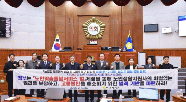 나주시의회는 이번 건의안을 통해 노인맞춤돌봄서비스의 지속 가능성 확보와 서비스 질 향상을 위해 '노인맞춤돌봄서비스 법'을 제정할 것, '노인맞춤돌봄서비스 법' 제정으로 노인생활지원사 권리 보장 및 고용불안 해소를 위한 법적 기반을 마련할 것을 촉구했다.