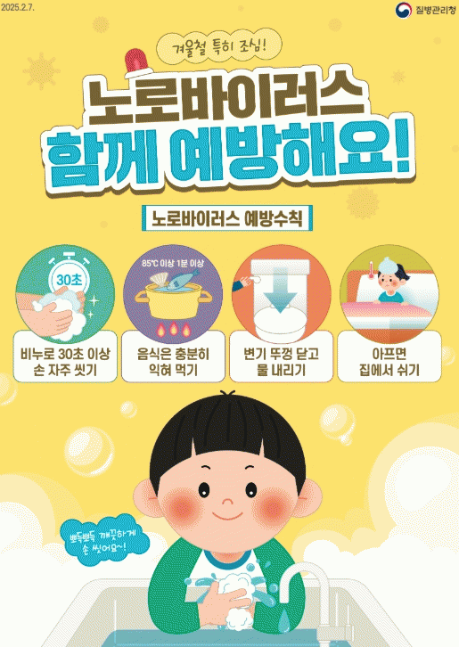 노로바이러스 환자는 증상이 사라진 후 48시간까지 등원, 등교 및 출근을 자제하고, 화장실 등 생활공간을 다른 가족과 구분하는 게 바람직하다.