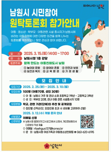 시 관계자는 “아동과 시민이 함께 소통할 수 있는 소중한 기회가 될 것”이라며, “다양한 의견을 듣고, 이를 반영하여 아동이 행복하고 안전하게 성장할 수 있는 남원시를 만들기 위해 최선을 다하겠다.”고 말했다.