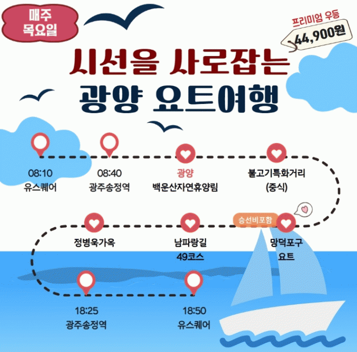 광양 요트 여행은 유스퀘어(08:10)~광주송정역(08:40)~백운산자연휴양림~불고기 특화거리(중식)~망덕포구 요트~남파랑길 광양로드 49코스~윤동주 유고 보존 정병욱 가옥~광주송정역(18:25)~유스퀘어(18:50) 등의 코스로 구성됐다.