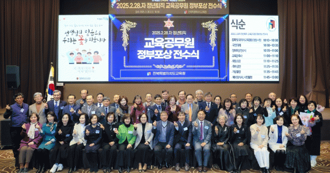 수상자는 △황조근정훈장 부용초등학교 신영희 교장 외 20명 △홍조근정훈장 외 전주우림중학교 김복희 교사 외 38명 △녹조근정훈장 갈담초등학교병설유치원 김경옥 교사 외 22명 △옥조근정훈장 전북유니텍고등학교 양운모 교장 외 13명 △근정포장 군산진포중학교 전준하 교사 외 2명 △대통령표창 인월초등학교 김향숙 교사 등이다.