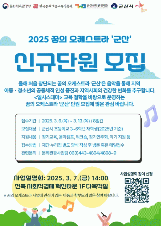 재단 관계자는 “꿈의 오케스트라 군산은 음악을 통해 아동·청소년이 올바르게 성장할 수 있도록 지원하는 매우 중요하고 의미 있는 사업.”이라며 “음악에 대한 경험이 없더라고 열정과 관심만 있다면 누구나 참여할 수 있는 만큼 학생들과 학부모의 적극적인 참여를 희망한다.”라고 밝혔다.