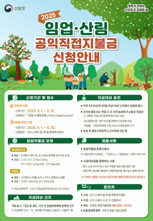 시 관계자는 “올해부터 신청 기간이 늘어난 만큼 임업인들이 신청을 놓치지 않도록 안내 문자 발송, 리플렛 배치 등 적극적인 홍보를 추진하겠다”고 밝혔다.