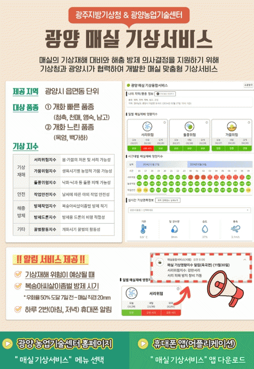 매실 기상서비스는 광양시 농업기술센터 홈페이지에서 확인할 수 있으며, 안드로이드 휴대폰의 경우 매실 기상서비스 앱을 설치하면 기상재해·방제시기 자동 알림 서비스도 받아볼 수 있다.