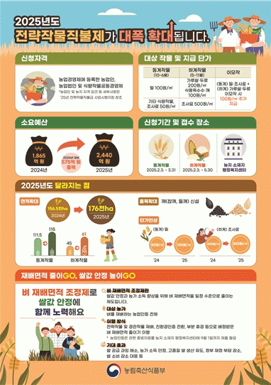 신청 및 자세한 사항은 농지 소재지 읍면동 사무소에서 확인할 수 있으며, 신청기간은 동계작물의 경우 2025년 2월 1일부터 3월 31일까지, 하계작물의 경우 2025년 2월 1일부터 5월 31일까지다.
