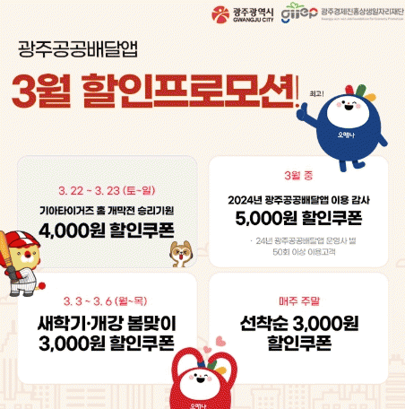 3월 특별할인 프로모션은 광주공공배달앱을 이용하고 있는 광주시민이면 누구나 참여할 수 있다. 공공배달앱 운영사인 ‘위메프오’와 ‘땡겨요’를 통해 할인쿠폰을 내려받을 수 있다.