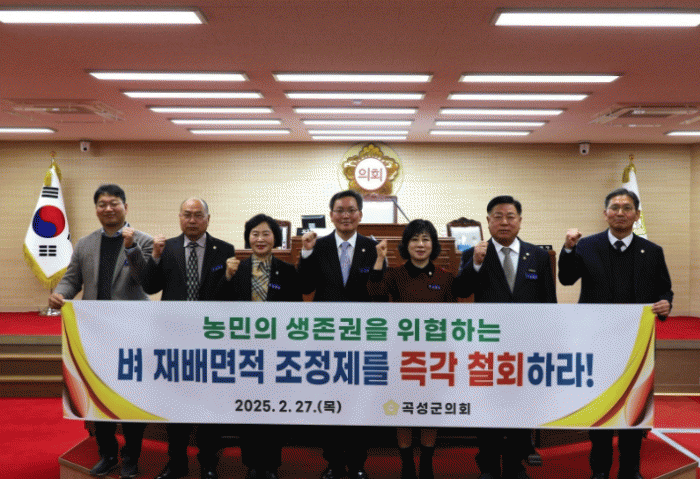 곡성군의회는 지역 농민들이 실질적인 피해를 입지 않도록 △벼 재배면적 조정제의 즉각 철회 △쌀 생산 농가의 안정적인 소득 보전을 위한 지속 가능한 대책 마련 △농업 현장의 의견이 반영된 정책 수립 등을 강력히 촉구했다.