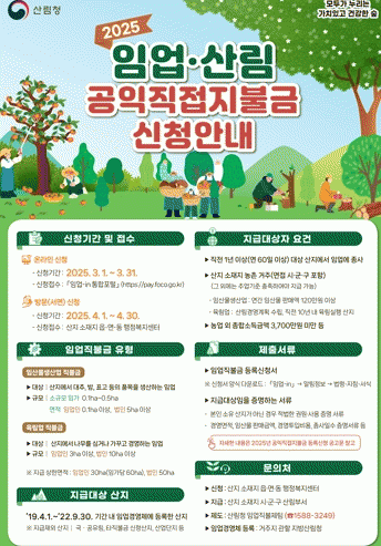 보다 자세한 사항은 완주군 홈페이지 공고문을 참조하거나 산림청 임업직불금 전화상담센터에 문의하면 알 수 있다.