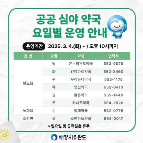 공공 심야 약국으로 지정된 곳은 총 8개소로 완도읍은 6개소(온누리완도약국, 건강마트약국, 우리동네약국, 영신약국, 맑은약국, 하나로약국), 노화읍 1개소(청해약국), 소안면 1개소(소안하늘약국) 등이며, 요일별로 22시까지 운영한다.