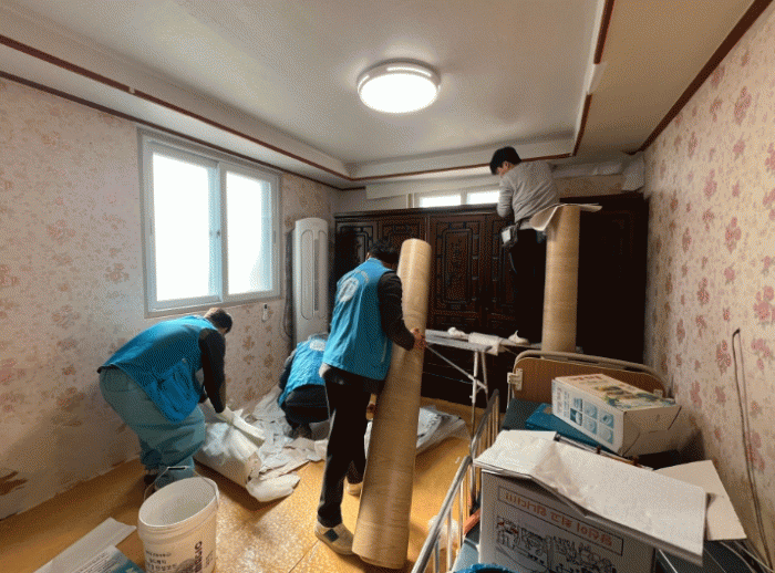 복지기동대는 지원 가구의 안전하고 편안한 주거 환경을 위해 도배 및 장판 교체 작업을 세심하게 진행하며 주택의 분위기를 밝고 깨끗하게 개선했다.