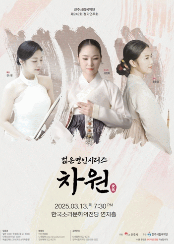 전주시립국악단의 제242회 정기연주회의 일환으로 마련되는 이번 공연은 봄을 맞이하는 ‘신춘음악회’와 전도유망한 국악 연주자들이 함께하는 ‘젊은명인시리즈’가 함께 이뤄지는 것으로, △파도(波濤): 물의 춤(작곡 장석진) △해금협주곡 ‘VERSES’(작곡 토마스 오스번) △창작국악관현악과 판소리를 위한 ‘춘향이야기’(작곡 조원행) △피리협주곡 ‘달의 눈물’(작곡 이정면), △‘춤추는 바다’(작곡 김성국) 등이 연주될 예정이다.