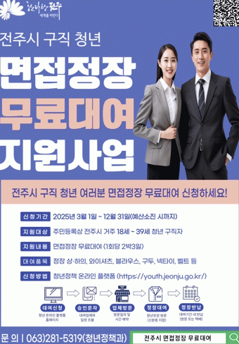 면접정장 무료 대여를 원하는 청년은 1인당 연3회(2박3일) 예산 소진 시까지 전주시 청년 온라인플랫폼을 통해 온라인으로 신청한 후 업체를 방문하면 된다.