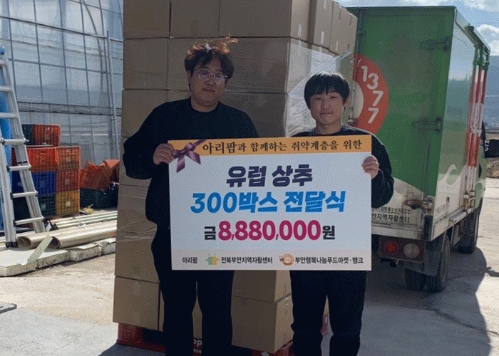 아리팜 김환수 대표는“소소하지만 어려운 이웃들의 밥상에 신선하고 건강한 먹거리를 전달해 드릴 수 있어 기쁘게 생각한다”며 “앞으로도 부안군과 함께 생동하는 부안 만들기를 위한 행복 나눔 활동을 이어나가겠다”고 말했다.