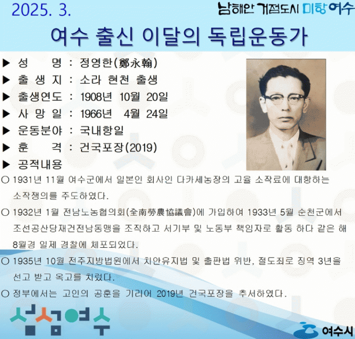 정영한 선생은 1908년 10월 20일 태생으로 1931년 11월 여수군에서 일본인 회사인 다카세농장의 고율 소작료에 대항하는 소작쟁의를 주도했다.