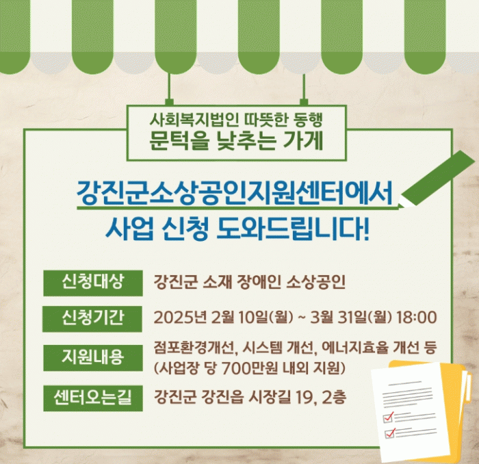 강진군 소상공인지원센터 관계자는 “강진군에서 사업을 영위하는 장애인 소상공인이 맞춤형 공간복지 지원사업을 통해 사업을 지속 영위하는데 필요한 지원을 받았으면 좋겠다”며 “사업 기간 내 발굴해 신청할 수 있도록 함께하겠다”고 말했다.
