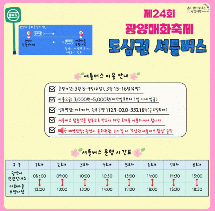 김미란 광양시 관광과장은 “광양 중마터미널을 기점으로 서울, 광주, 부산 등 대도시에서 오는 관광객들이 대중교통을 이용해 축제장까지 원활하게 이동할 수 있도록 주말 도심권 셔틀버스를 운영하게 됐다”고 말했다.