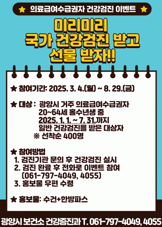 또한, 올해 건강검진 대상자가 7월 31일까지 검진을 완료하면 ‘의료급여수급권자 건강검진 이벤트’에 참여할 수 있다. 참여자 중 선착순 400명에게는 소정의 선물을 제공한다.