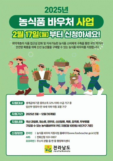박상미 전남도 농식품유통과장은 “취약계층이 신선한 농식품을 섭취해 영양 개선에 기여하고, 더 나아가 지속적인 농식품 소비 기반이 확충되도록 지원하겠다”며 “지원 대상자가 모두 혜택을 받도록 홍보를 강화하고 향후 지원 대상 범위가 확대되도록 노력하겠다”고 말했다.
