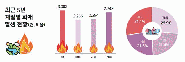 최근 5년간(2020년~2024년) 도내 화재 발생 현황을 분석한 결과 총 10,605건 중 봄철(3~5월)에 발생한 화재는 3,302건(31.1%)으로 가장 많았다.
