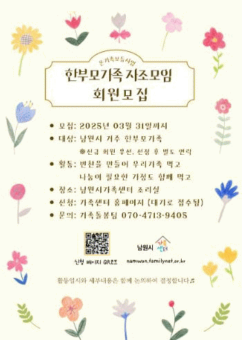 모집대상은 남원시에 거주하는 한부모가족(신규회원 우선)으로 남원시가족센터 홈페이지를 통해 신청하면 된다.