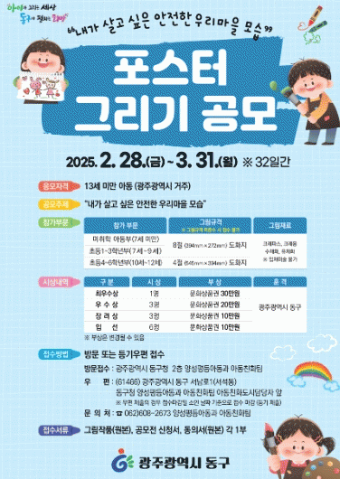 응모 기간은 31일까지이며, 광주 거주 12세 이하 아동이면 누구나 참여 가능하다. 참가를 원하는 아동은 동구 누리집에서 양식 등을 참조해 작품과 함께 제출하면 된다.