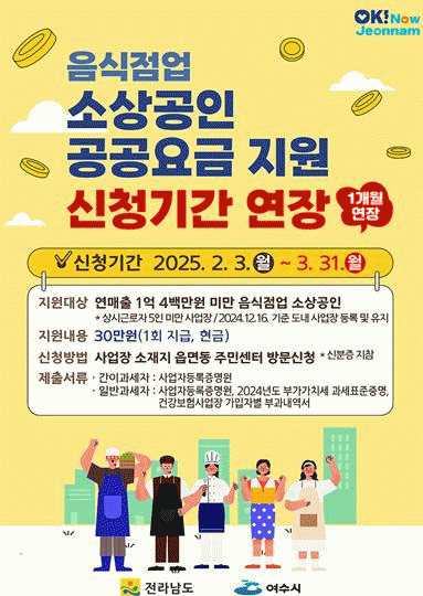 본 사업은 경기침체로 어려움을 겪고 있는 소상공인을 돕기 위해 전기, 수도 등 공공요금 부담을 줄여주는 것으로, 보다 많은 소상공인이 혜택을 받을 수 있도록 기존 2월 말에서 3월 말까지 연장 접수를 실시한다.