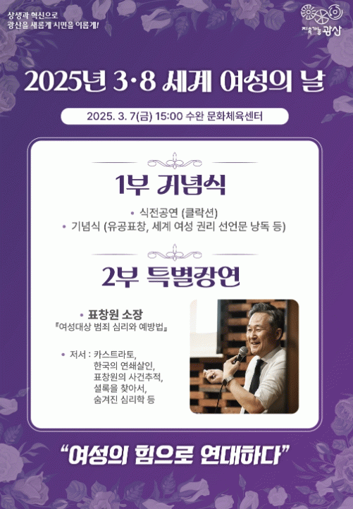 광산구는 7일 오후 3시 수완문화체육센터에서 ‘여성의 힘으로 연대하다’라는 구호로 3‧8 세계 여성의 날 기념행사를 개최한다고 밝혔다.