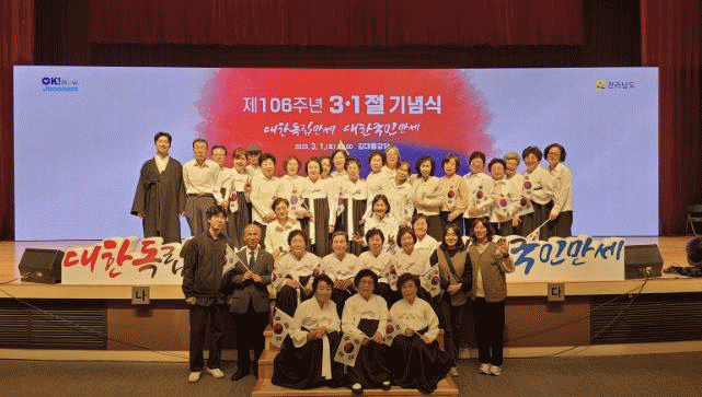 특히, 함평군 노인복지관 나비사랑 합창단원 30명이 애국가 및 삼일절 노래를 제창하며 기념식에 더욱 깊은 울림을 더하고 참석자들에게 큰 감동을 선사했다.