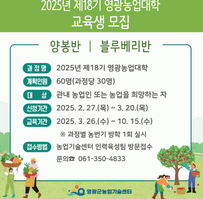 교육신청은 영광군에 거주하는 농업인은 누구나 지원이 가능하며 신분증, 농업경영체 등록확인서, 사진 등을 지참하여 농업기술센터에 방문하면 된다.