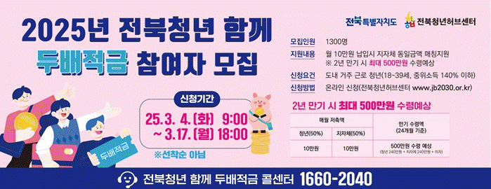 ‘전북청년 함께 두배적금’은 청년이 매월 10만 원을 저축하면, 전북자치도가 동일한 금액 10만 원을 추가 적립해 2년 후 최대 500만 원(원금 480만 원+이자)을 수령할 수 있는 자산 형성 지원 사업이다.