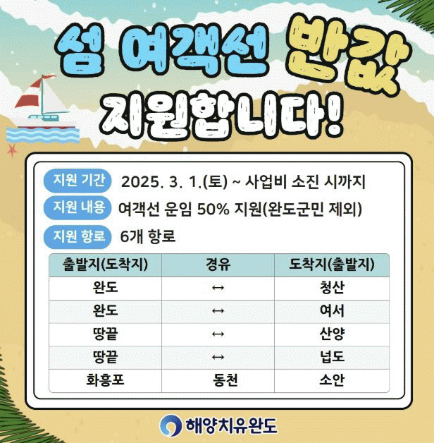 여객선 반값을 지원받을 수 있는 항로는 완도-청산, 완도-여서, 땅끝-산양, 땅끝-넙도, 화흥포-동천-소안 등 6개이다.
