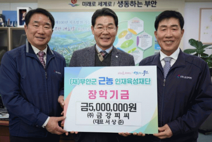권익현 부안군 근농인재육성재단 이사장은 “노인 보행보조기 지원, 이웃사랑 성금 지원 등 지역 기부 문화 확산에 힘써온 기업이 부안군 인재양성을 위한 장학금을 기부해주셔서 감사드린다”, “장학재단에 기부해 주신 뜻을 소중히 여겨 소외된 학생들이 한 명도 없도록 장학 사업을 펼쳐나가겠다” 라며 감사의 마음을 전달했다.