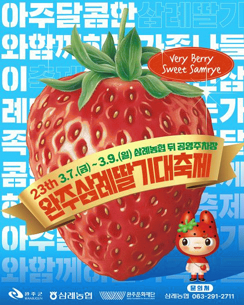 이번 축제는 삼례농협과 완주문화재단이 주관하며, 3일간 딸기를 주제로 다채로운 프로그램과 공연, 체험, 이벤트를 통해, 방문객들에게 특별한 달콤한 봄날의 추억을 선사할 예정이다.