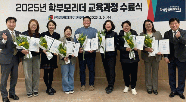 이날 수료식에서는 민완성 전북특별자치도교육청교육연수원장이 직접 수료증을 수여했으며 학부모 활동 지원을 위한 전문가로서의 새로운 출발을 격려했다.