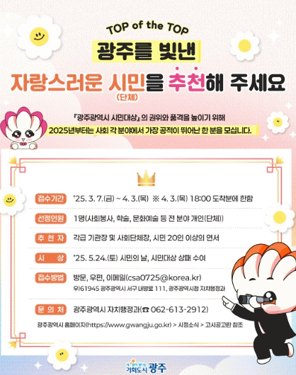 시민대상 후보자는 광주시 누리집 공고일(2월28일) 기준 3년 이상 광주시에 거주하면서 광주시의 명예와 지역발전에 공적이 있는 사람(단체)으로, 각급 기관장 또는 사회단체장, 시민 20인 이상 연서로 추천할 수 있다.