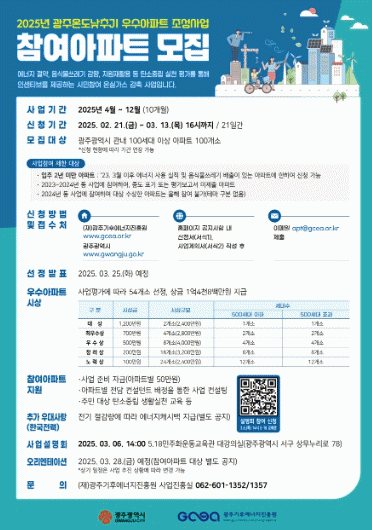 광주광역시는 ‘2025년 광주 온도 낮추기 우수아파트 조성사업’에 참여할 아파트 100곳을 모집한다.