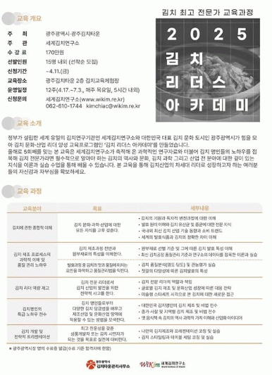 특히 ‘김치를 맛있게 담그는 방법’ 뿐만 아니라 김치의 역사·문화에 대한 전문지식과 김치 제조공정 분야 혁신 기술 등 세계김치연구소가 축적한 과학적인 연구자료와 함께 전문가들의 노하우를 접목시킨 체계적 학습이 가능하도록 설계됐다.